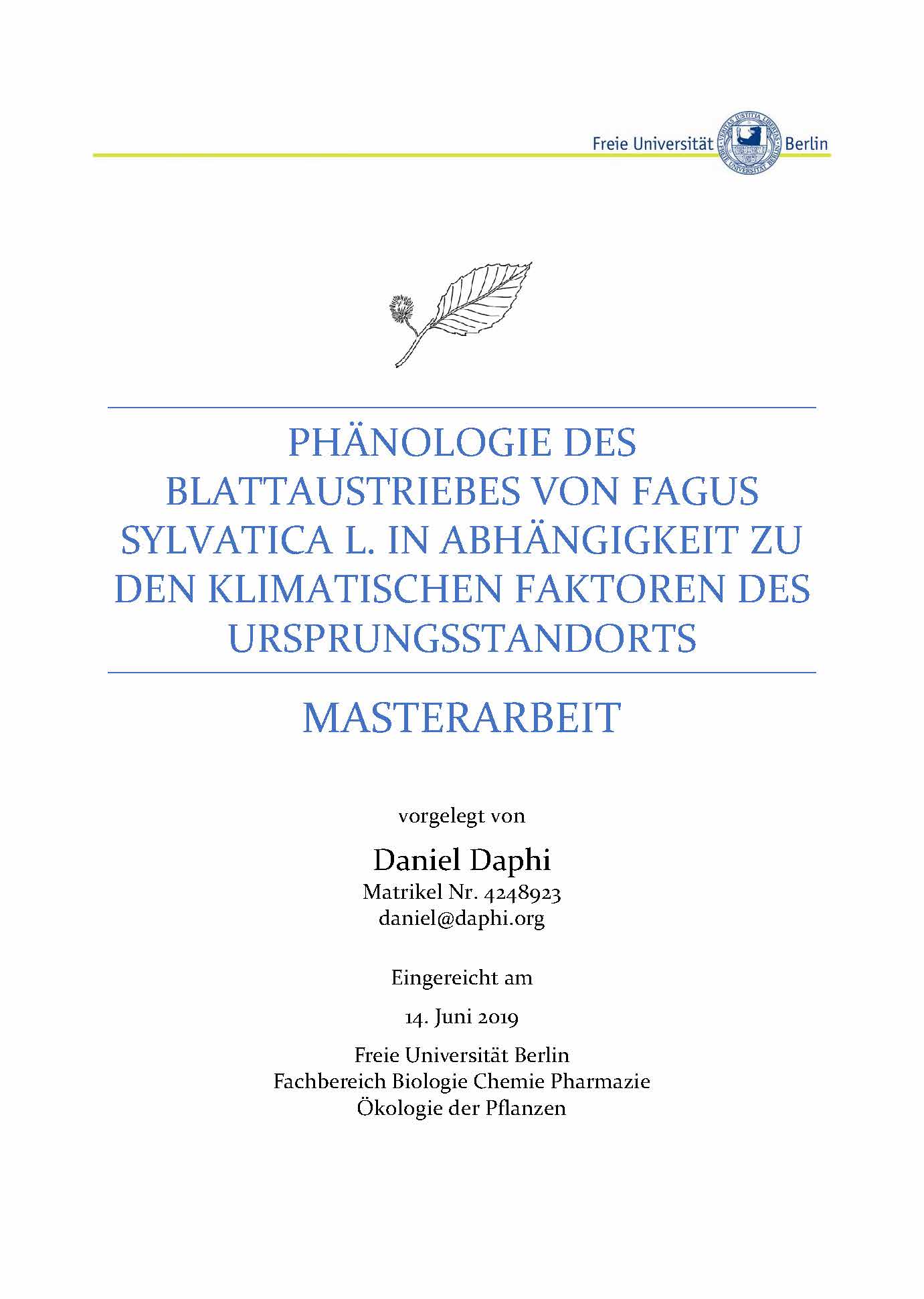 Um die zukünftige Entwicklung europäischer Baumarten unter dem Einfluss des Klimawandels besser zu verstehen, ist ein vertieftes Wissen über lokale Anpassung und phänotypische Plastizität notwendig. In dieser Arbeit wurden Klimaursprungsdaten für die Europäische Buche (Fagus sylvatica L.) analysiert, um zu ermitteln, ob das Klima der Herkunftsregionen einen Einfluss auf den Blattaustrieb am Versuchsstandort besitzt.