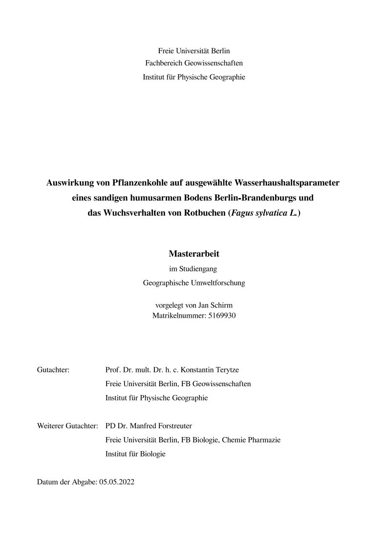 von darin gepflanzten Rotbuchen (Fagus sylvatica L.) wurde die Wirkung der Pflanzenkohle auf den
